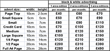 The Small Print: All rates shown are plus 20% v.a.t. Ongoing and Discounted Packages are for adverts booked for consecutive months and the discount is given on condition that all of the booking agreed to is used and paid for. Cancellations are accepted during the booking period but are subject to a cancellation fee of any discount previously given.