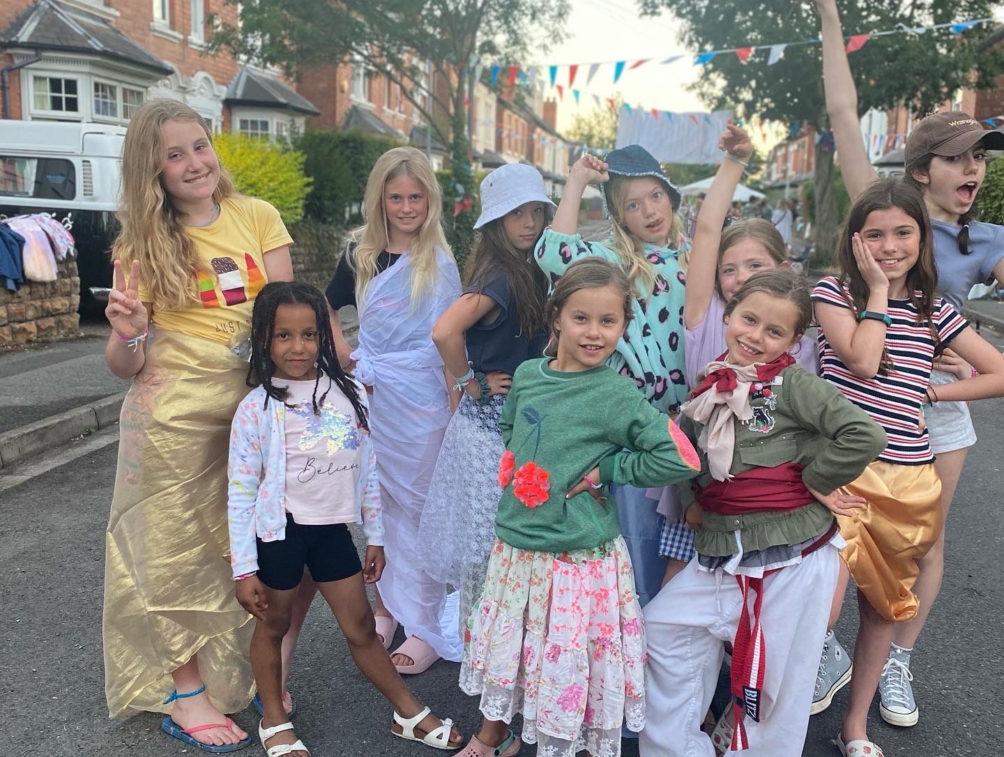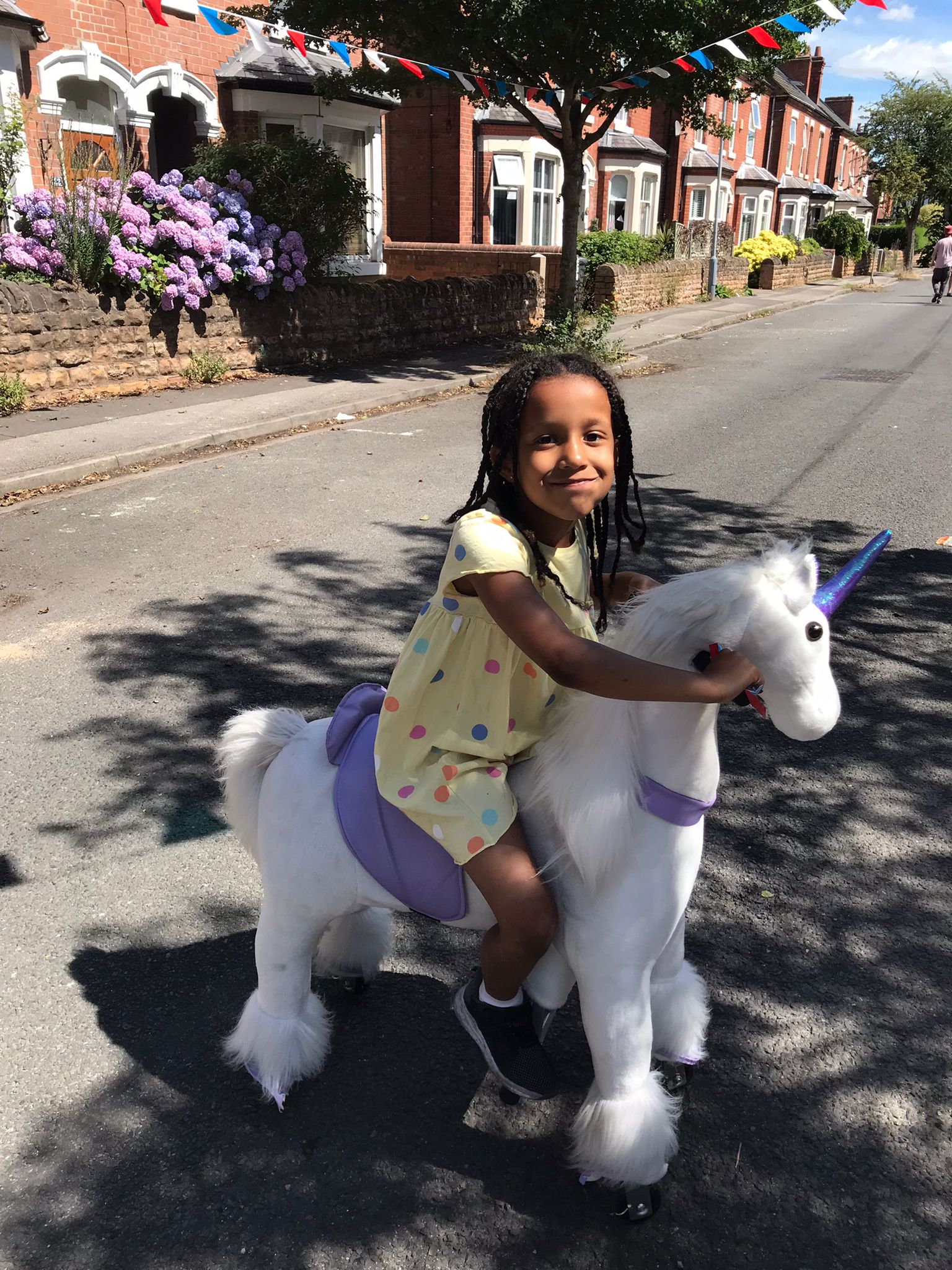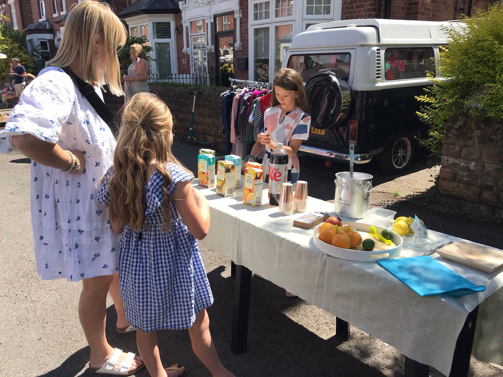 With the road closed from 8am, work soon began on hanging the bunting and South Road street party banner. Children began cycling and scooting up and down and chalking the road with pictures. Later in the morning children set up their stalls for residents to support, with games, lucky dips, homemade lemonade, brownies, necklaces and bracelets, and a selfie opportunity with a life-sized picture of the Queen, as well as selling off their preloved toys, games, books and clothes. All money raised will be sent to support Stonebridge City Farm.